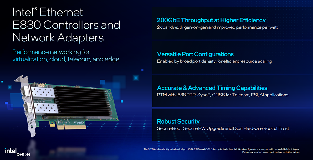 英特尔以太网控制器E830和网络适配器提供200GbE的带宽、灵活的端口配置和出色的精准授时,包括精确时间测量(PTM)。该产品为高密度虚拟化工作负载进行了优化,可提供灵活的端口配置、出色的时间同步能力与卓越的安全功能。