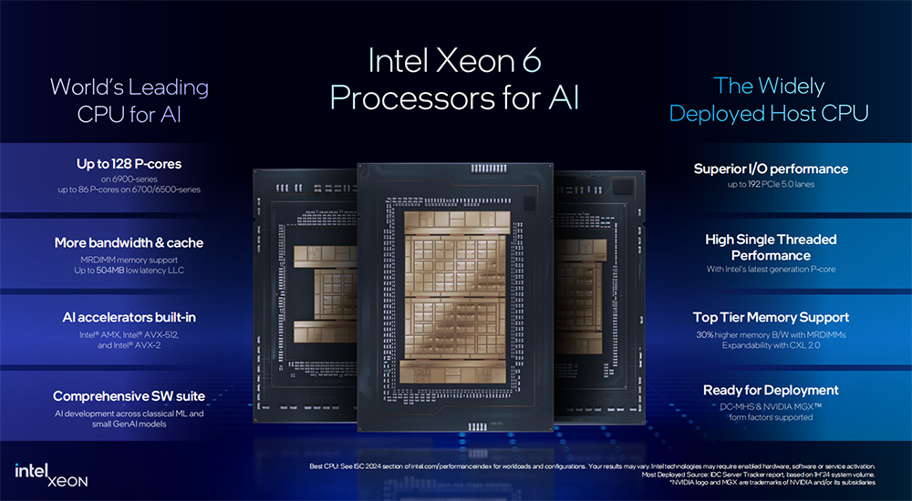 作为AI系统的机头节点CPU,至强6可与GPU搭配,为客户提供优选组合。此外,它以2/3的核心数量,提供高达1.5倍的AI推理性能提升。