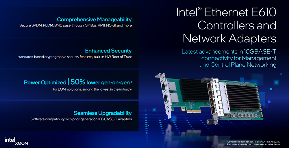 针对控制平面操作优化,英特尔以太网控制器E610和网络适配器提供10GBASE-T连接,将可管理性、能效与安全性集于一身,从而简化网络管理,并为网络完整性提供重要保障。