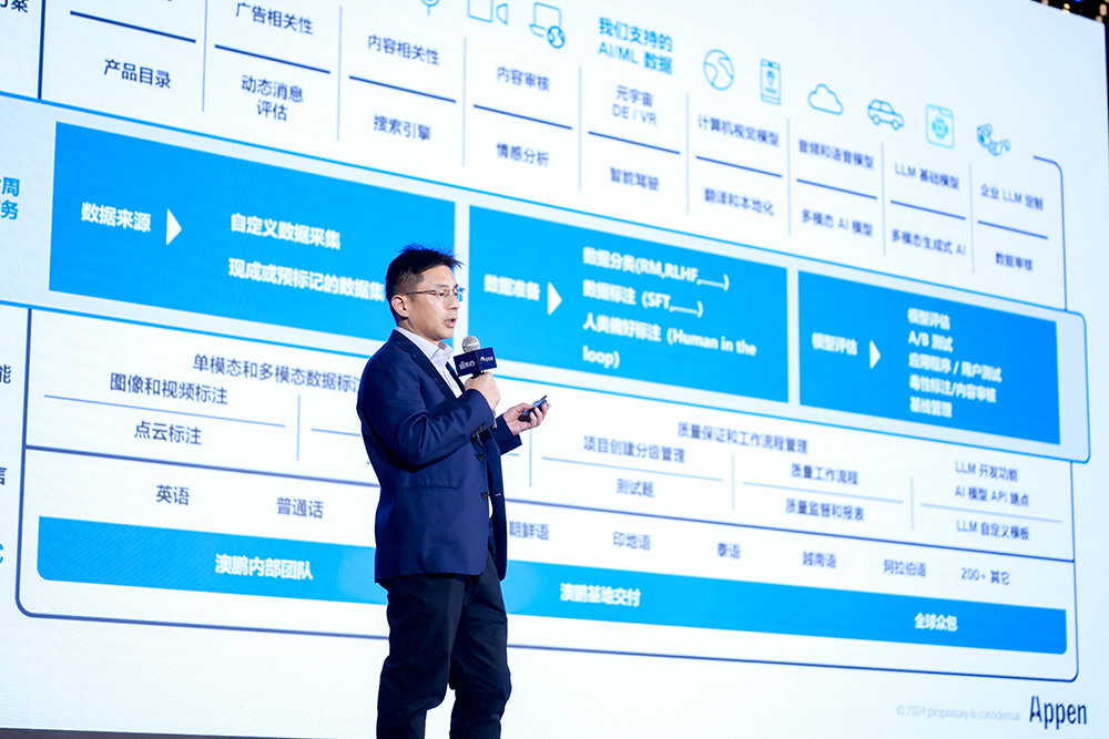 澳鹏Appen中国及韩国区副总裁董成通过澳鹏在各领域大模型部署中数据训练的最佳实践,重点分享了对大模型应用趋势的观察。以AI Agent为代表,未来,大模型必定应用到具体的垂直领域中,比如金融、医疗、代码、音乐、文学等。