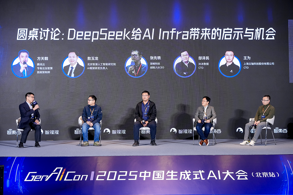 圆桌讨论环节以《DeepSeek给AI Infra带来的启示与机会》 为主题,由腾讯云专有云及智算首席架构师方天戟主持,回顾了过去两个月AI从业者们围绕DeepSeek、具身智能等展开的一系列技术攻关,北京智源人工智能研究院AI框架研究负责人敖玉龙、澎峰科技创始人兼CEO张先轶、沐冰数据CTO邸泽民、云轴科技CTO王为分享了对最新产业趋势的观察与思考。