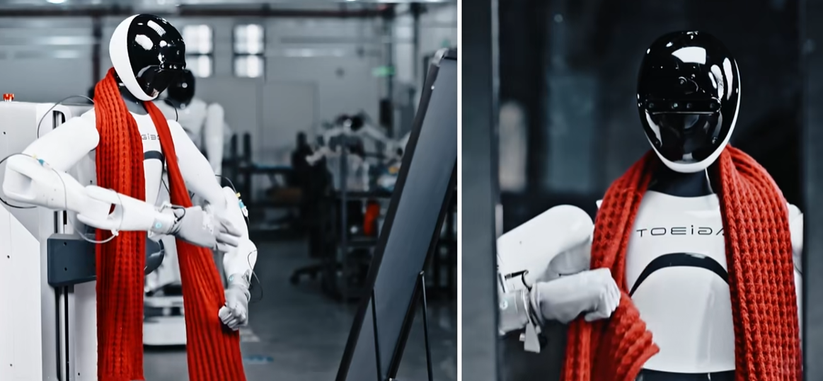 例如,让机器人完成具有生物运动特征的围巾佩戴任务时,首先模型会通过观察镜子中围巾和头的相对位置,完成围巾的初始佩戴;然后根据两侧的长度比例,左手准确地握住需要调整的一端,将其拉到适当的位置;紧接着,右手接过左手递过来的围巾,执行“围”的螺旋缠绕动作。