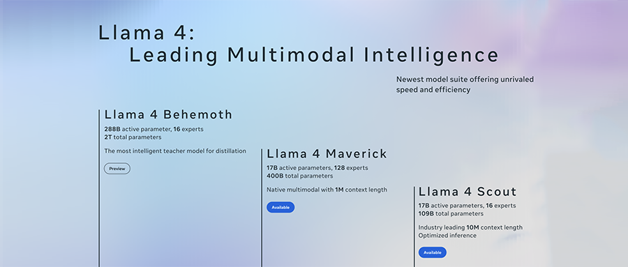 智东西4月6日报道,今日,Meta发布Llama 4系列首批模型,包括两款高效模型Llama 4 Scout、Llama 4 Maverick。这是Meta首款采用混合专家(MoE)架构构建的原生多模态模型,其中Scout更是首度支持超长10M上下文窗口。Meta还预览了其迄今最强大的新教师模型——Llama 4 Behemoth。