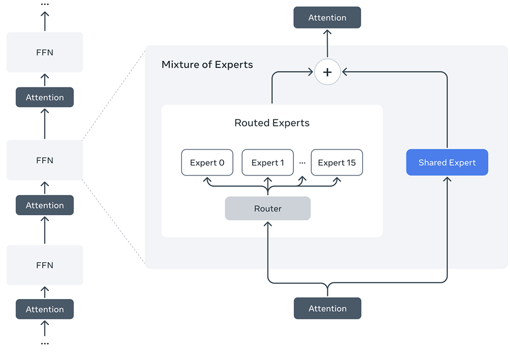 例如,Llama 4 Maverick模型有17B个活跃参数和400B个总参数。Meta使用交替的密集和混合专家(MoE)层来提高推理效率。