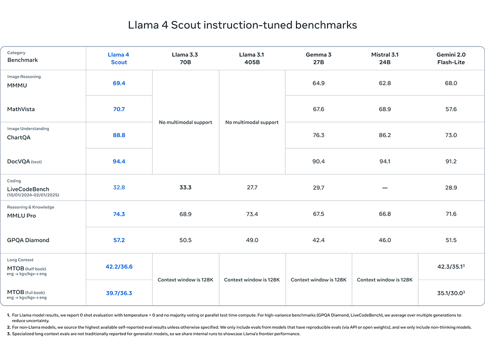 “小杯”Llama 4 Scout拥有16位专家、170亿个活跃参数、1090亿个总参数,被称作“同类产品中全球最好的多模态模型”,提供1000万tokens上下文窗口(对应多达500万个单词的文本),适用于单张NVIDIA H100 GPU(具有Int4量化),并在广泛基准测试中分数超过Gemma 3、Gemini 2.0 Flash-Lite、Mistral 3.1。