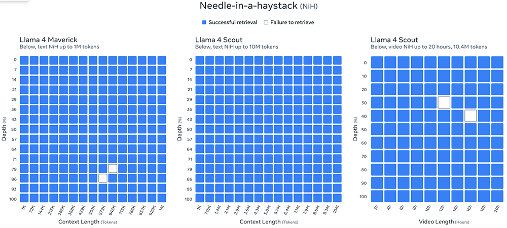 Meta继续在所谓的“中期训练”阶段训练模型,以使用新的训练方案(包括使用专门的数据集进行长上下文扩展)来提高核心功能。这使其能够提高模型质量,同时为Llama 4 Scout解锁超长的10M输入上下文长度。