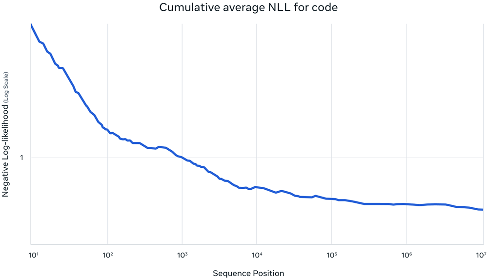 Meta在诸如对文本进行“大海捞针”式检索以及对1000万个代码token进行累积负对数似然(NLL)等任务中展示了令人信服的结果。