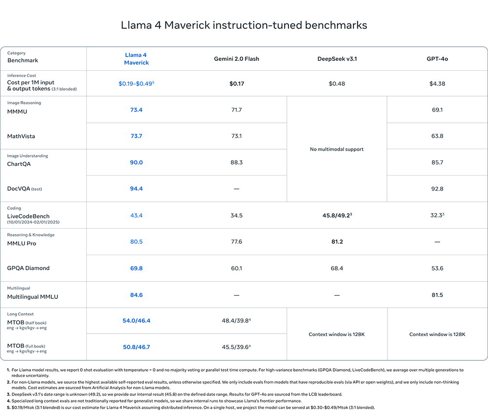 Llama 4 Maverick是同类最佳的多模态模型,在编程、推理、多语言、长上下文和图像基准测试中超越了GPT-4o和Gemini 2.0等同类模型,并且在编程和推理方面可与活跃参数规模大得多的DeepSeek v3.1相媲美。