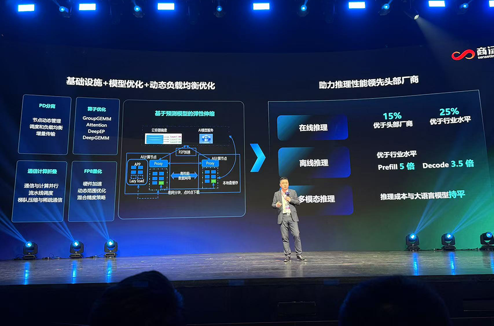 通过PD分离/通信计算折叠/FP8强化/算子优化等基础设施与模型协同优化,结合预测模型驱动的弹性伸缩技术,商汤大装置实现了推理性能的突破,在线服务性能较头部厂商提升15%,超行业平均水平25%;离线推理方面,Prefill阶段提速5倍,Decode阶段提速3.5倍。