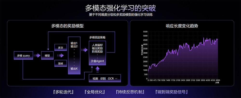 (2)多模态强化学习:构建了面向多种图文任务的混合增强学习框架,可以同步进行基于人类偏好的RLHF、基于确定性答案或沙盒运行的RFT,并通过动态调节机制保证主客观表现的均衡。