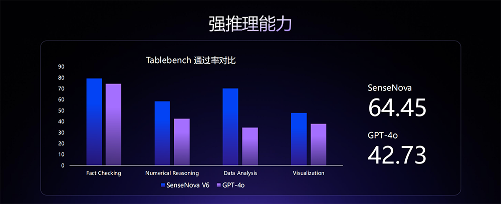 SenseNova V6的Tablebench通过率超过GPT-4o,展现出强推理能力。