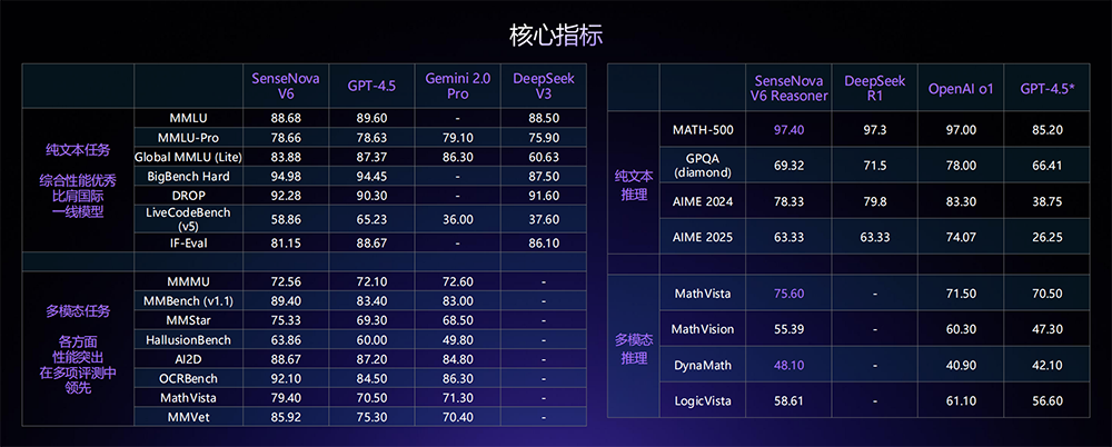 其中,纯文本推理和多模态推理方面,SenseNova V6在多项数学基准测试中的超过了DeepSeek-R1、OpenAI o1、GPT-4.5。