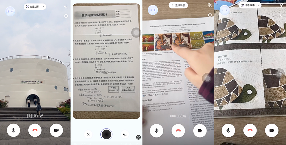 另外通过商量app,不仅有常见的文字聊天、图片问答、深度思考等功能,还能进行音频通话和视频通话,并针对四大高频需求,提供「数学解题」、「点读翻译」、「文旅讲解」、「绘本讲解」四大功能。