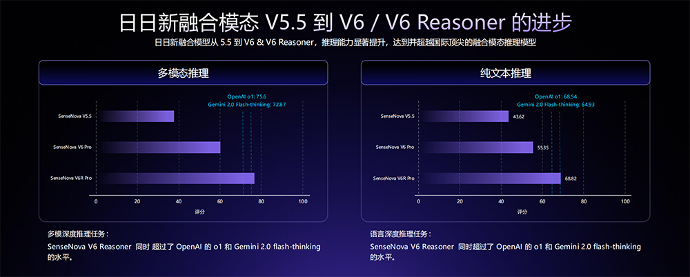 其推理能力显著提升,一个模型同时在多模态推理和纯文本推理上做到性能对标国际领先模型。从商汤展示的分数来看,SenseNova V6 Reasoner推理模型的推理能力超过了OpenAI o1和Gemini 2.0 flash-thinking。