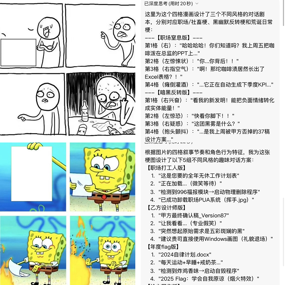 除了当导游、讲解员,「日日新SenseNova V6」也能玩创意,智东西实测了让它给空白梗图设计对话,脑洞开得既多又大。