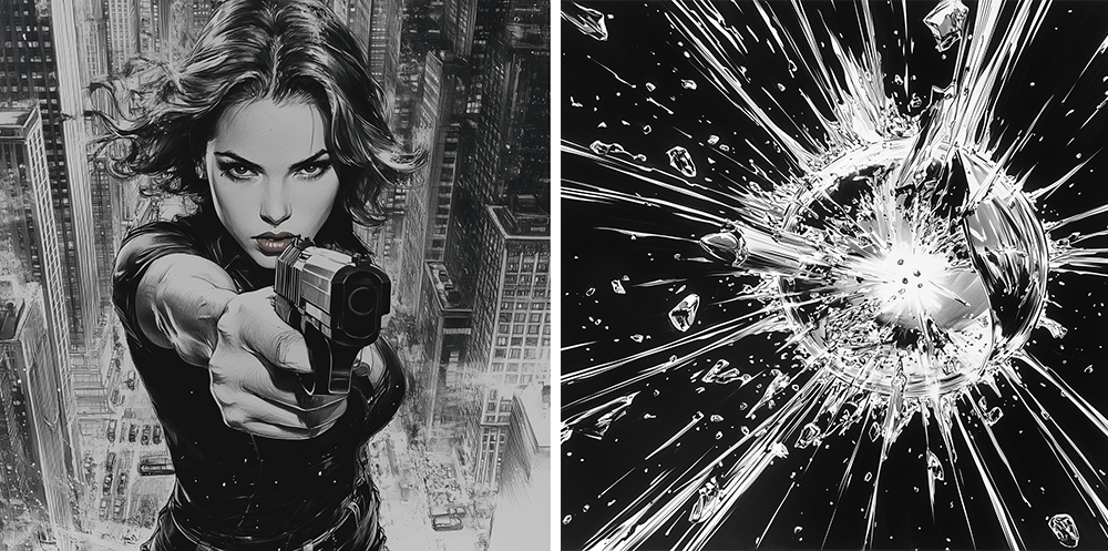 输入提示词“女特工手持手枪,射出子弹,子弹穿破玻璃球瞬间爆炸,吉恩·科兰的漫画风格,紧张刺激的动画场景”后,Vidu Q1生成的视频效果是这样的: