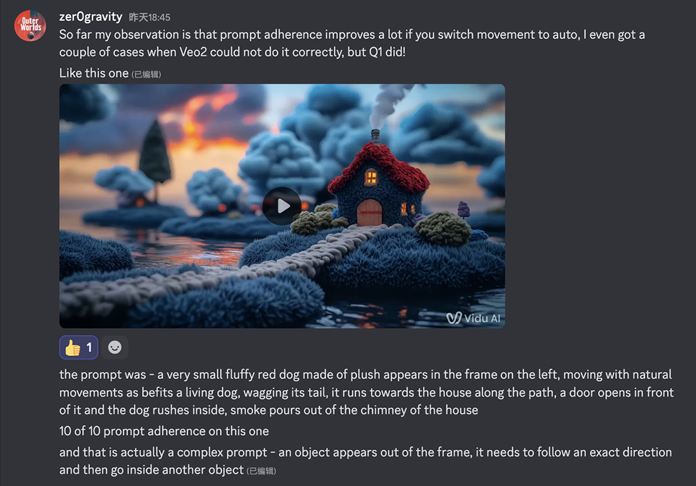 有海外网友反馈说,Vidu Q1对提示词的遵循表现提升很多,能执行一些复杂的提示词,比Veo2的表现更好。