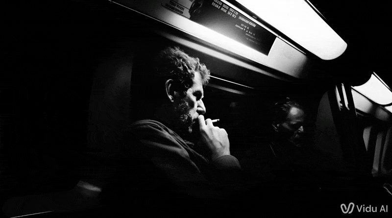 提示词:寂静的车厢里,老人抽着香烟,烟雾弥漫,车厢内的灯光忽明忽暗,镜头推进拍摄,推进到老人的脸部。
