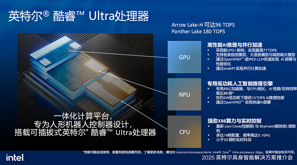 英特尔酷睿Ultra产品线把CPU、GPU、NPU封装在一个SoC里,让低功耗SoC可提供强劲的CPU算力、AI算力,满足了具身智能在绝大多数场景需求。