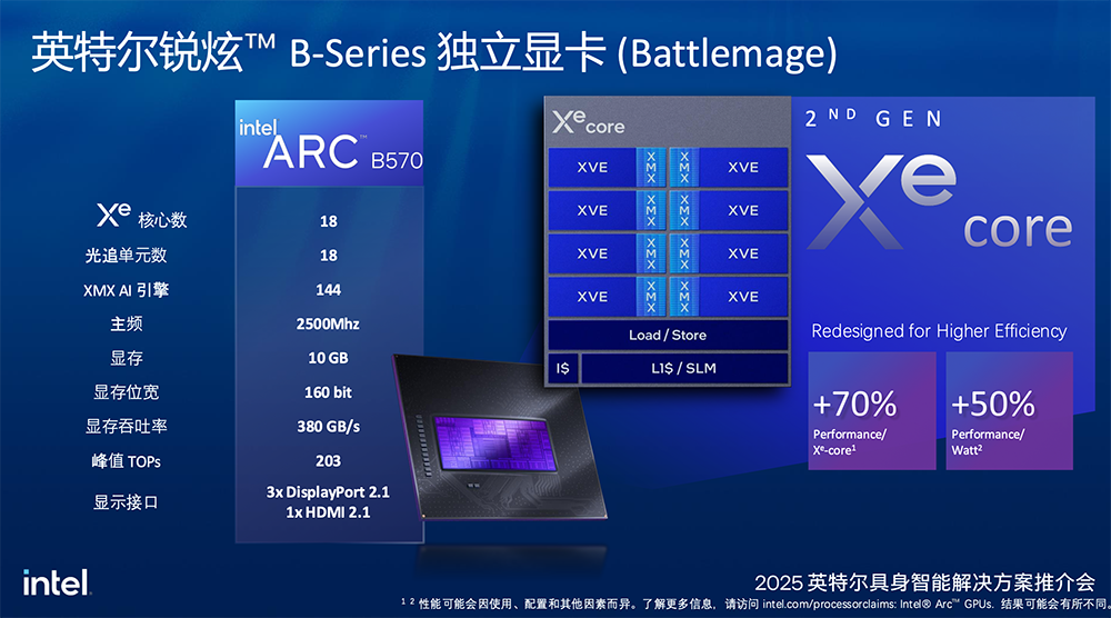 英特尔具身智能方案搭载了最新一代的英特尔锐炫B系列显卡(Battlemage)。该独立显卡采用Xe2架构核心,相较上一代产品效率提升显著,每个Xe核心的性能提升高达70%,每瓦性能也提升了50%。