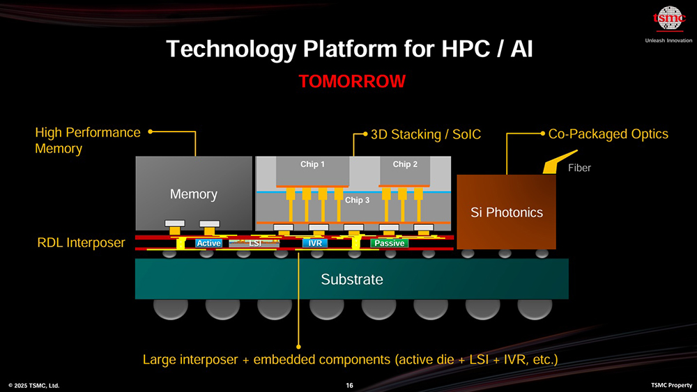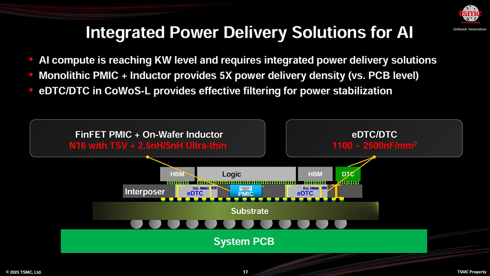 台积电提供一系列解决方案,以增强其逻辑技术的计算能力和效率。这些解决方案包括与台积电紧凑型通用光子引擎(COUPE)的硅光子集成、用于HBM4的N12和N3逻辑基片,以及用于AI的全新集成电压调节器(IVR),与电路板上单独的电源管理芯片相比,其垂直功率密度提高了5倍。