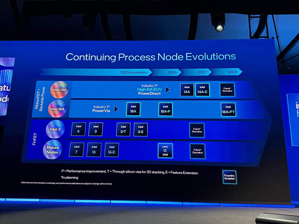 会上,英特尔公布最新制程工艺技术路线图,计划今年年内量产Intel 18A(1.8nm),2026年推出Intel 18A-P节点以及与联电合作的12nm制程工艺,2027年推出Intel 14A及其变体Intel 14A-E,2028年推出Intel 18A-PT制程,并首次披露先进节点Intel 14A(1.4nm)的详细规格。