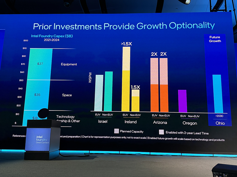 下图展示了英特尔在以色列、爱尔兰、美国亚利桑那州、美国俄勒冈州等地正在运行的前端产能以及过去四年投资的部署计划,包括EUV和非EUV规划。
