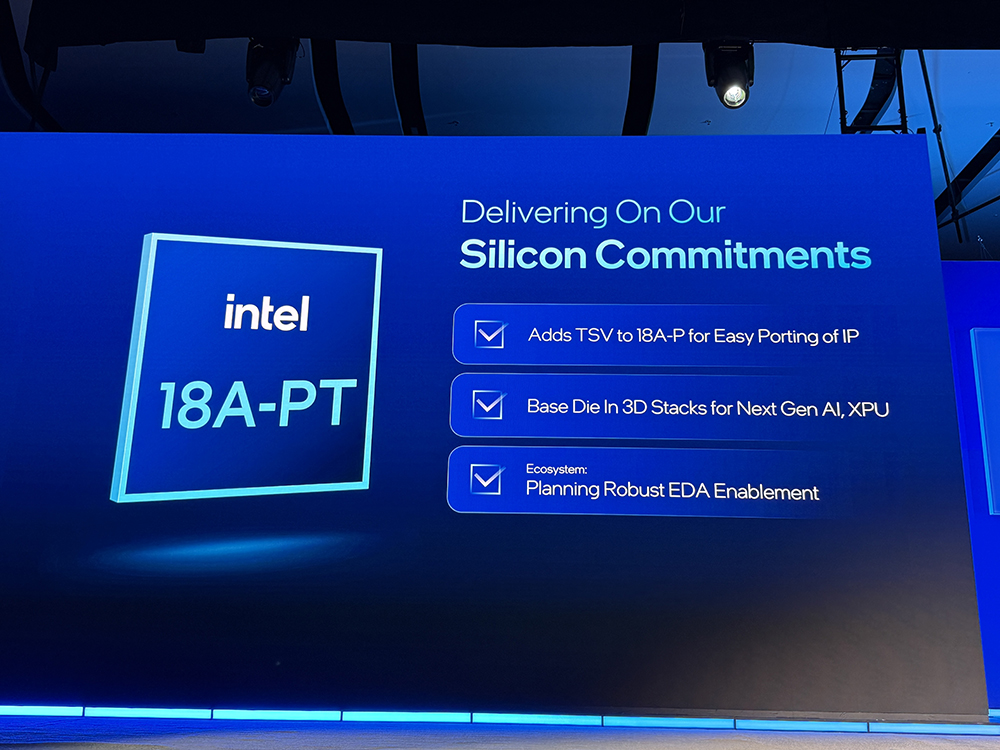 Intel 18A-P基础上,英特尔推出另一种Intel 18A演进版本Intel 18A-PT。该节点加了TSV(硅通孔)技术,可通过Foveros Direct 3D先进封装技术与顶层芯片连接,混合键合互连间距小于5μm。