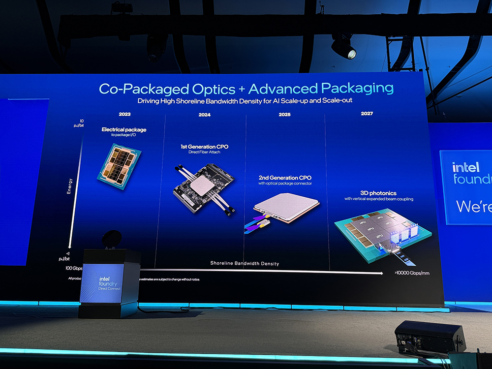 英特尔还在推进光电共封装研发。与传统的电互连相比,光互连在带宽、延迟、能效等方面具有优势,结合英特尔先进封装,可在扩展AI解决方案以及提供更密集的互连能力、低延迟和更高吞吐量方面带来显著优势。