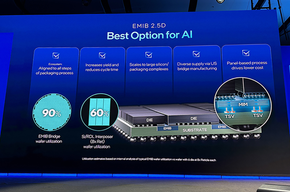 EMIB嵌入式多芯片互连桥接是英特尔的一种2.5D先进封装技术,能高效经济地连接平面上集成多个die。英特尔认为EMIB 2.5D是AI用例的最佳选择,可用于替代传统大尺寸中介层,提升良率和生产效率。