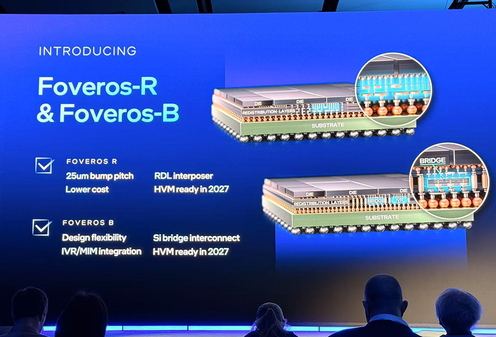 3D封装技术Foveros可将不同尺寸的芯片在垂直层面堆叠封装,降低封装凸点的间距,提高封装集成的密度。为进一步优化成本,英特尔推出两种新的解决方案——Foveros-B和Foveros-R,预计2027年量产。