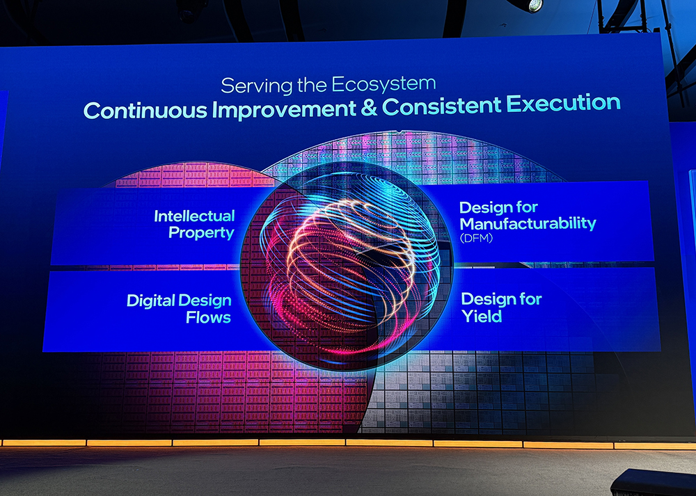 英特尔服务代工生态系统的四大支柱是知识产权(IP)、为可制造性设计(DFM)、数字化设计流程和为量产设计。