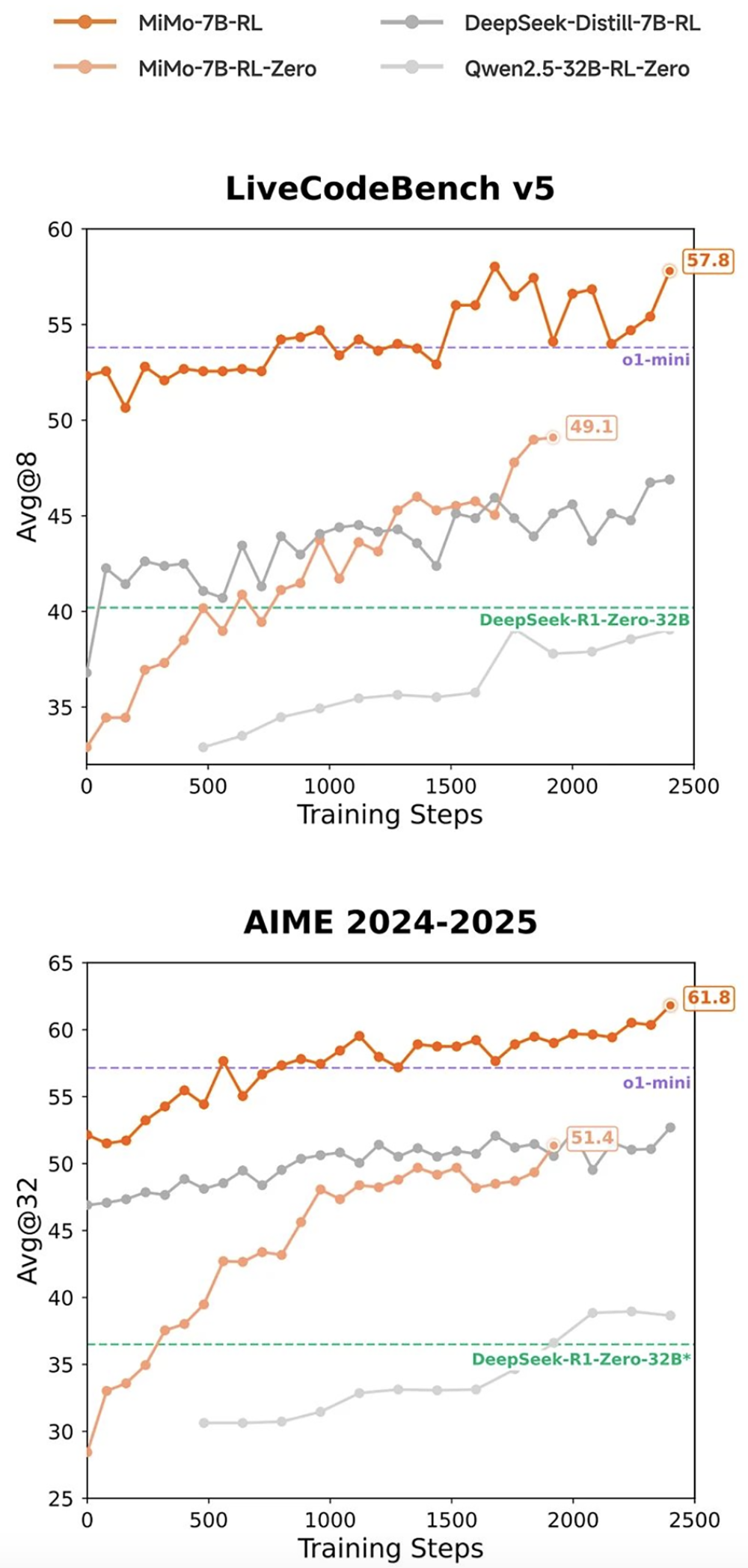 在数学基准测试AIME 2025测试、代码基准测试LiveCodeBench v6中,MiMo-7B-RL的得分均超过OpenAI o1-mini。