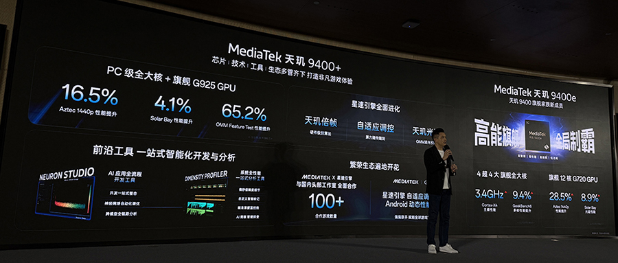 联发科技无线事业部总经理李彦辑介绍了联发科技与一加联合打造的全新天玑9400旗舰家族新成员9400e。