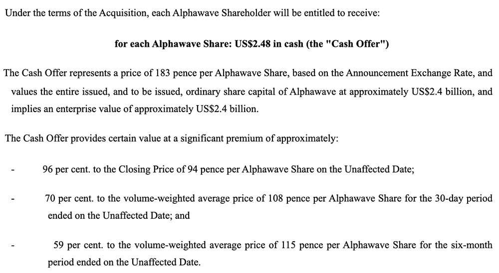 Alphawave股东可选择以现金或高通股票形式接受报价。根据收购条款,接受收购的Alphawave股东将有权获得每股2.48美元现金,比高通披露收购意向前的收盘价溢价近96%。