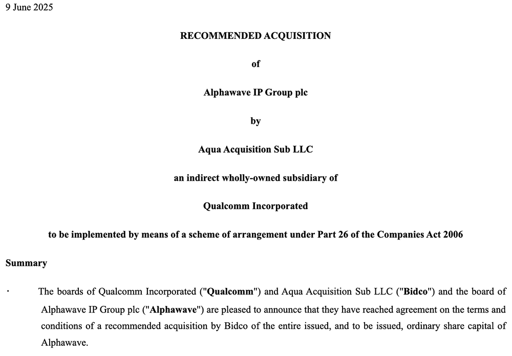 芯东西6月9日报道,今日,美国芯片巨头高通宣布同意以约24亿美元(约合人民币172亿元)的交易价收购英国半导体上市公司Alphawave。该交易还需获得监管机构的批准,预计将于2026年第一季度完成。收购完成后,Alphawave将退市,并在高通集团旗下私有化运营。