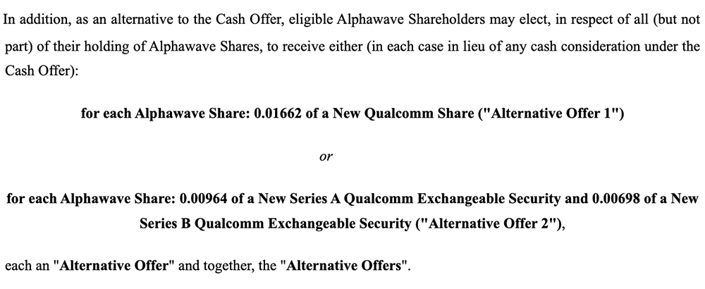股东还可以选择以每股Alphawave股票换取0.01662股高通新股。每股Alphawave股票可兑换0.00964股新的“A系列高通可交换证券”和0.00698股新的“B系列高通可交换证券”。该可交换证券在4年锁定期内不上市且不可转让,并将在16个季度发行日内逐步转换为高通股票。