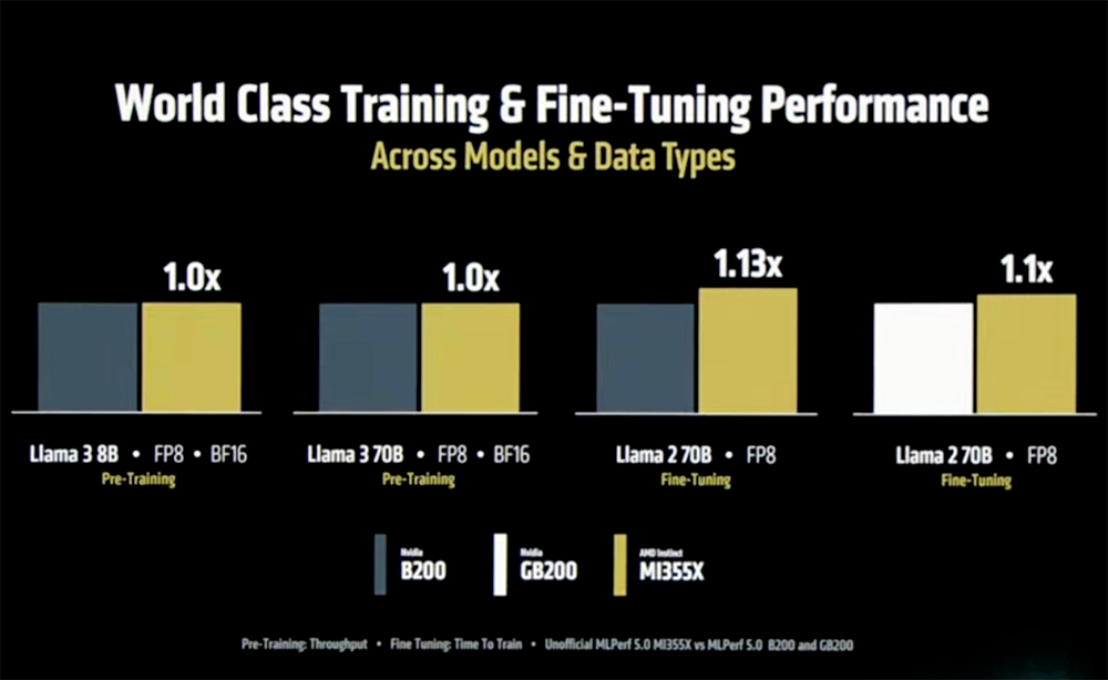 训练方面,与上一代MI300X相比,在FP8精度下进行Llama 3 70B模型预训练,MI355X可提供3.5倍的吞吐量;在微调Llama 2 70B时,MI355X可实现多达2.9倍的加速。