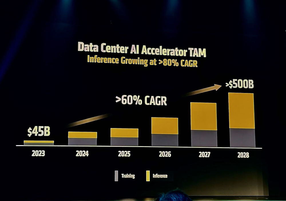 据苏姿丰博士分享,数据中心AI加速器TAM市场将每年增长60%以上,到2028年达到5000亿美元,预计推理将在未来几年内每年增长80%以上,成为AI计算的最大驱动力。