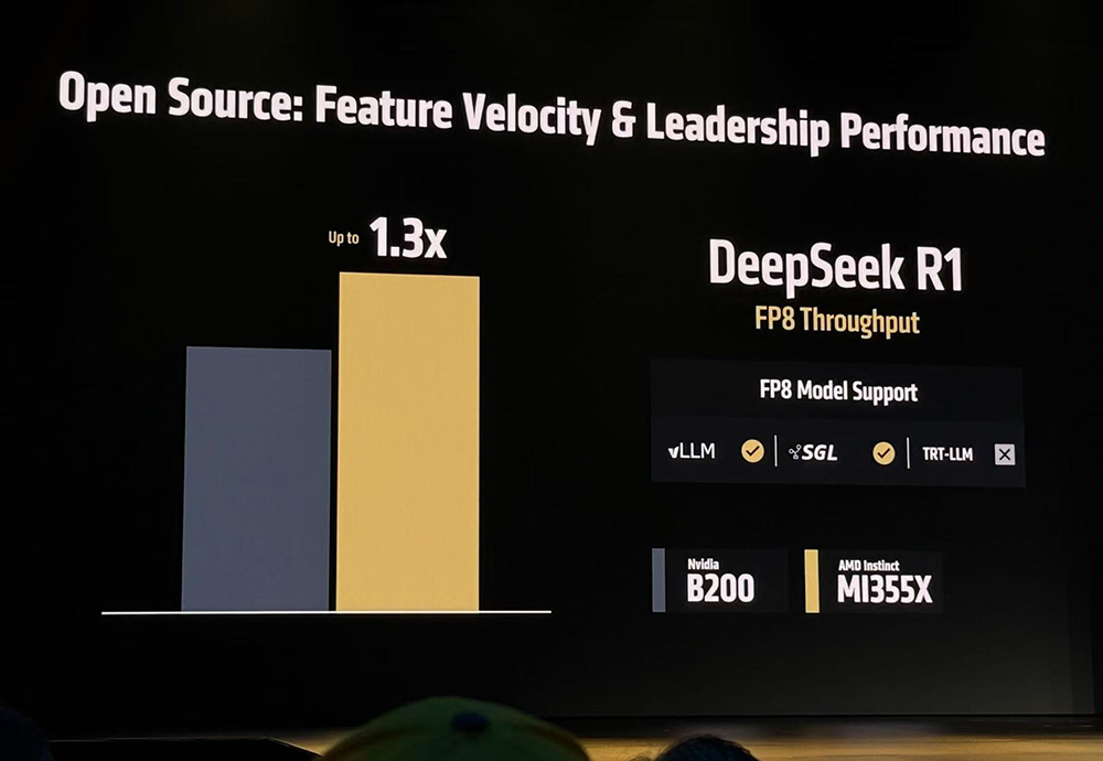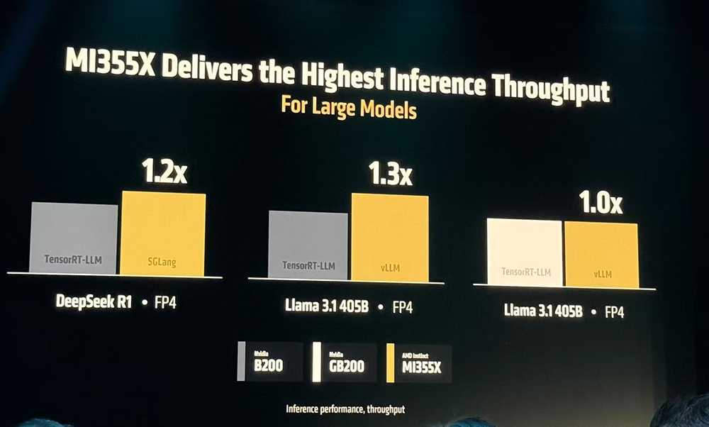 在采用相同GPU数量、以FP4精度运行DeepSeek R1和Llama 3.1 405B模型时,相比英伟达B200使用自研TensorRT-LLM推理引擎,MI355X使用SGLang、vLLM等开源推理框架的推理性能可提升20%~30%。