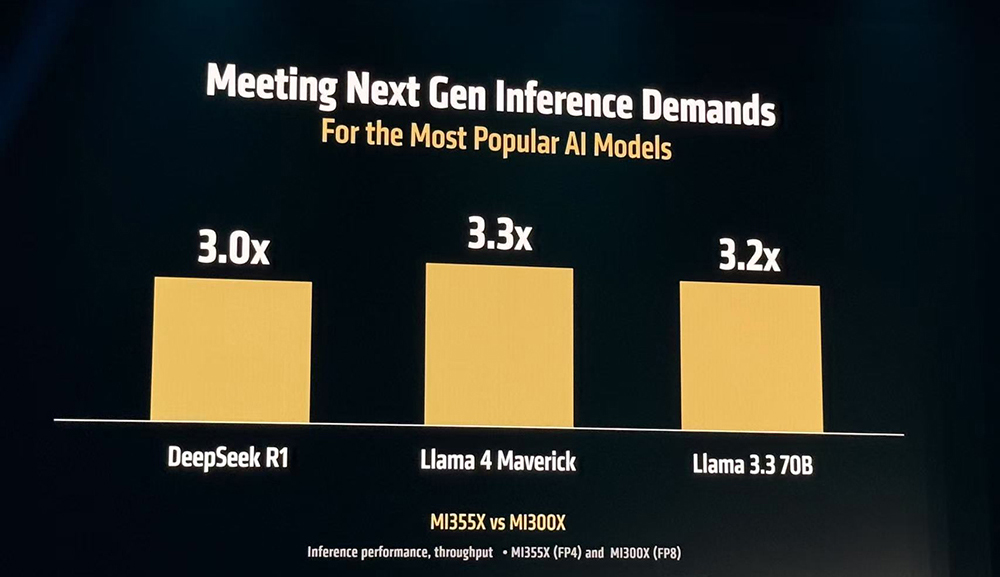 无论是运行DeepSeek R1、Llama 3 70B还是Llama 4 Maverick,MI355X都能实现3倍于MI300X的推理性能。