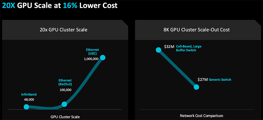 为了支持大量GPU一起工作,AMD与100多家公司一起成立了超以太网联盟(Ultra Ethernet)。超以太网技术是以太网的进化,能扩展至英伟达Infiniband的20倍、经典以太网的10倍。