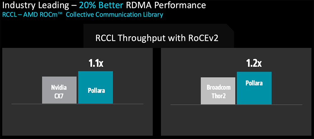 相比英伟达ConnectX7、博通Thor2,AMD Pollara可实现高出10%~20%的RDMA性能。