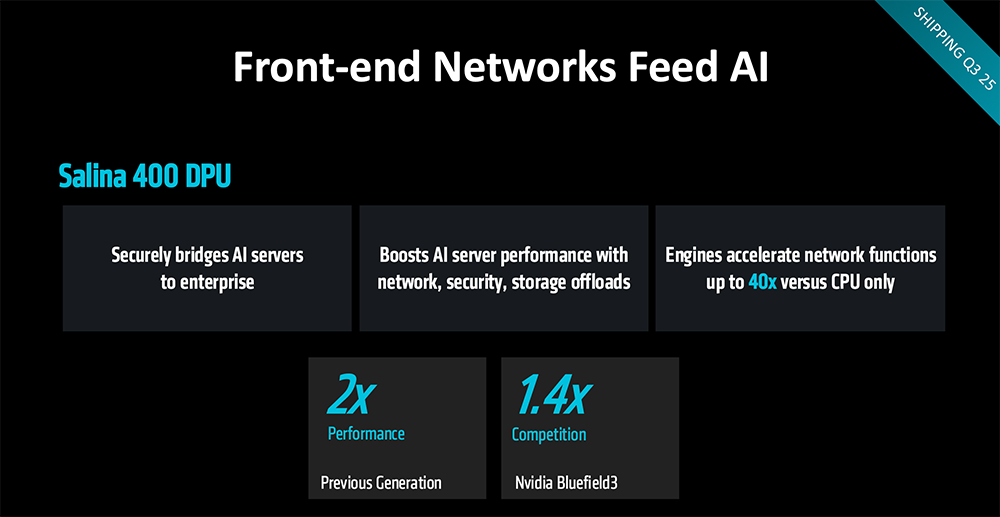 在GPU系统连接的前端网络方面,AMD宣布Salina 400 DPU将在今年第三季度推出,目标成为“目前市场上性能最好、最安全、可扩展的AI前端网络基础设施”。