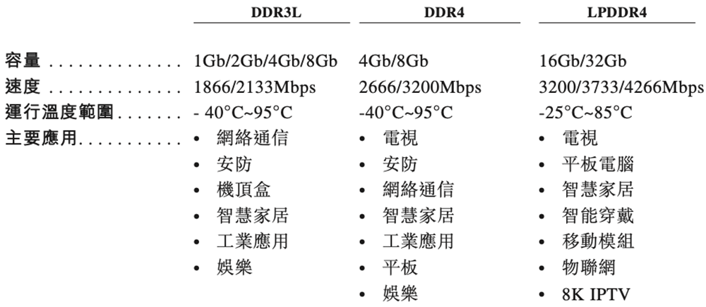 (3)利基型DRAM:包括DDR3L/DDR4/LPDDR4等,具备低功耗、体积小的特点,主要应用于机顶盒、电视、网络通讯、智慧家庭装置、智能穿戴、信息娱乐系统等多种领域。