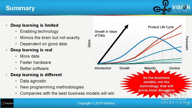 总结看来,深度学习对数据强烈依赖,而分析图像数据,更是要求人工智能拥有机器视觉的能力。而数据的来源本身以及各种应用场景都会带来全新的商业模式,加上更快的硬件,更好的软件,找对商业模式的公司就会在这波爆发中胜出。