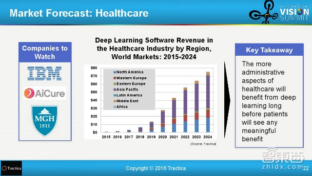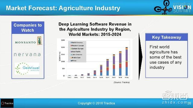 涉及到的大公司是Monsanto,Nervana,GeoVisual,到2024年,深度学习在全球农业的软件收入将超过2亿美元。(不知习大大去东北视察黑土地时会不会想到这个问题~)