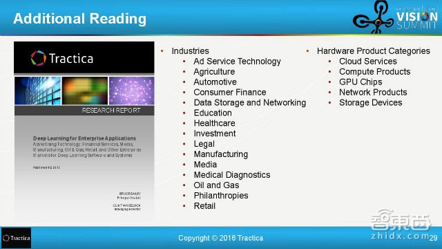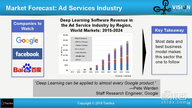 本周的智能内参推荐的报告来自Tractica,这是美国的一家市场调研智库,重点研究人机交互。报告主要解释了深度学习如何对机器视觉市场起到推动作用,也就是指人工智能识别图像的能力。报告同时对全球的深度学习产业链进行了梳理,还预测了深度学习对几大行业推动的市场预测。可以在智东西(公众号:zhidxcom)回复关键词“深度学习”下载报告全文。