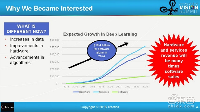 到2024年,深度学习仅仅在软件方面的市场价值就会超过104亿美元,更何况硬件和服务方面的收入会是软件份额的数倍以上。