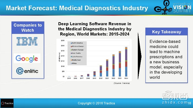 涉及到的大公司是IBM,谷歌和Enlitic,到2024年,深度学习在全球医疗诊断业的软件收入将逼近3亿美元。这样基于检测证据的医疗技术可以推动机器处方以及新的商业模式,尤其是在发展中国家。(是不是一瞬间想起了频繁攻占医院的马云爸爸?!)